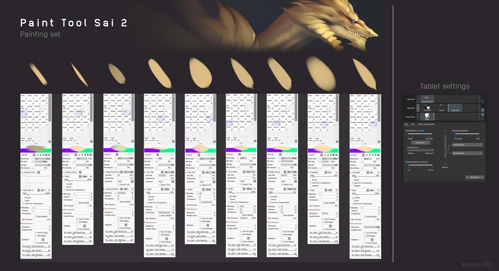 A set of Paint Tool Sai 2 brushes I made in 2021. I switched from Sai 1 to Sai 2, and had to recreate some brushes from my old version. I really missed some painting brushes too I used in very old work of mine. I tried to recreate some brushes from long ago and added some new ones along the way.